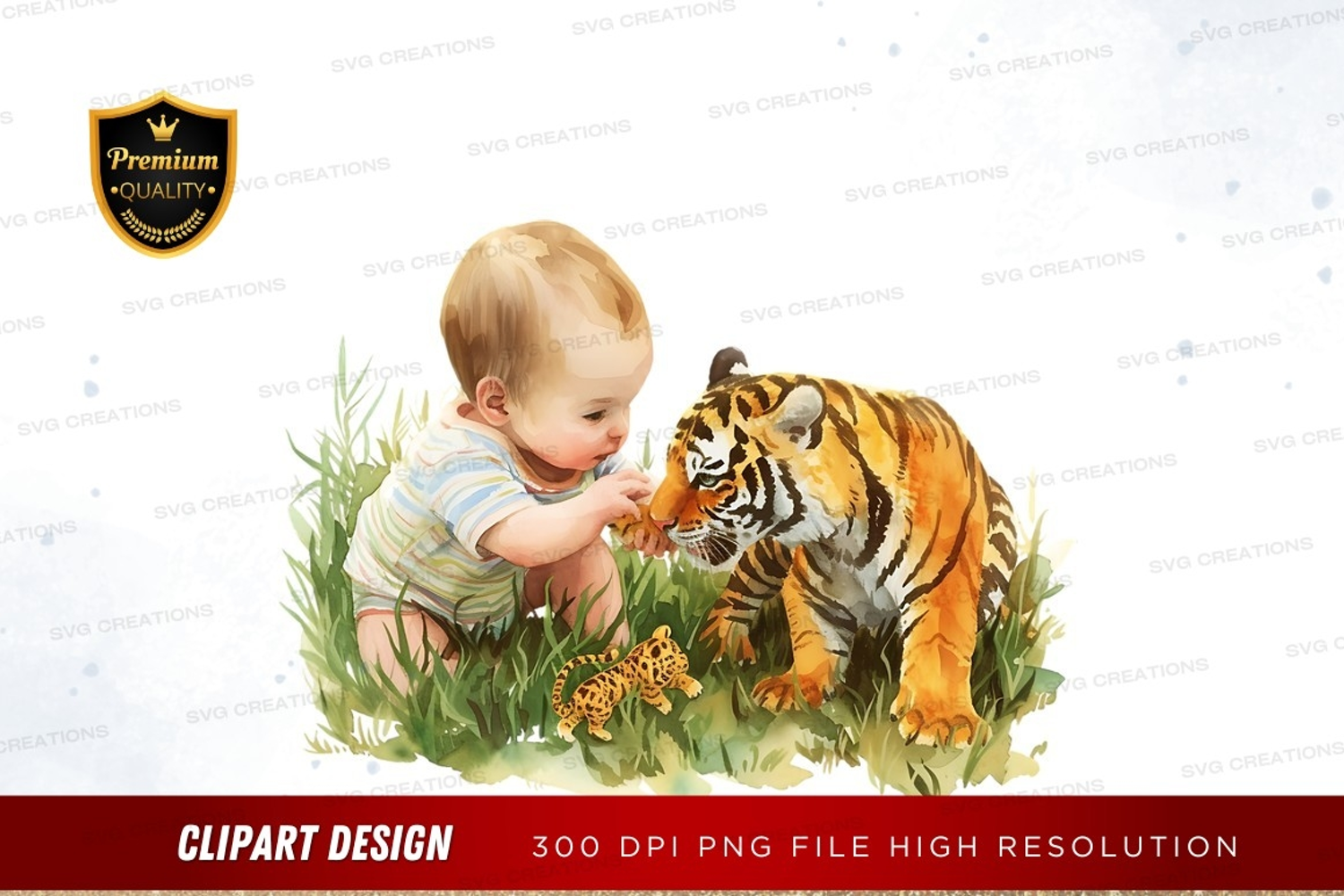 Child Illustration Watercolor Baby Nature Clipart Wildlife Tiger Tiger Cub Leopard Cub