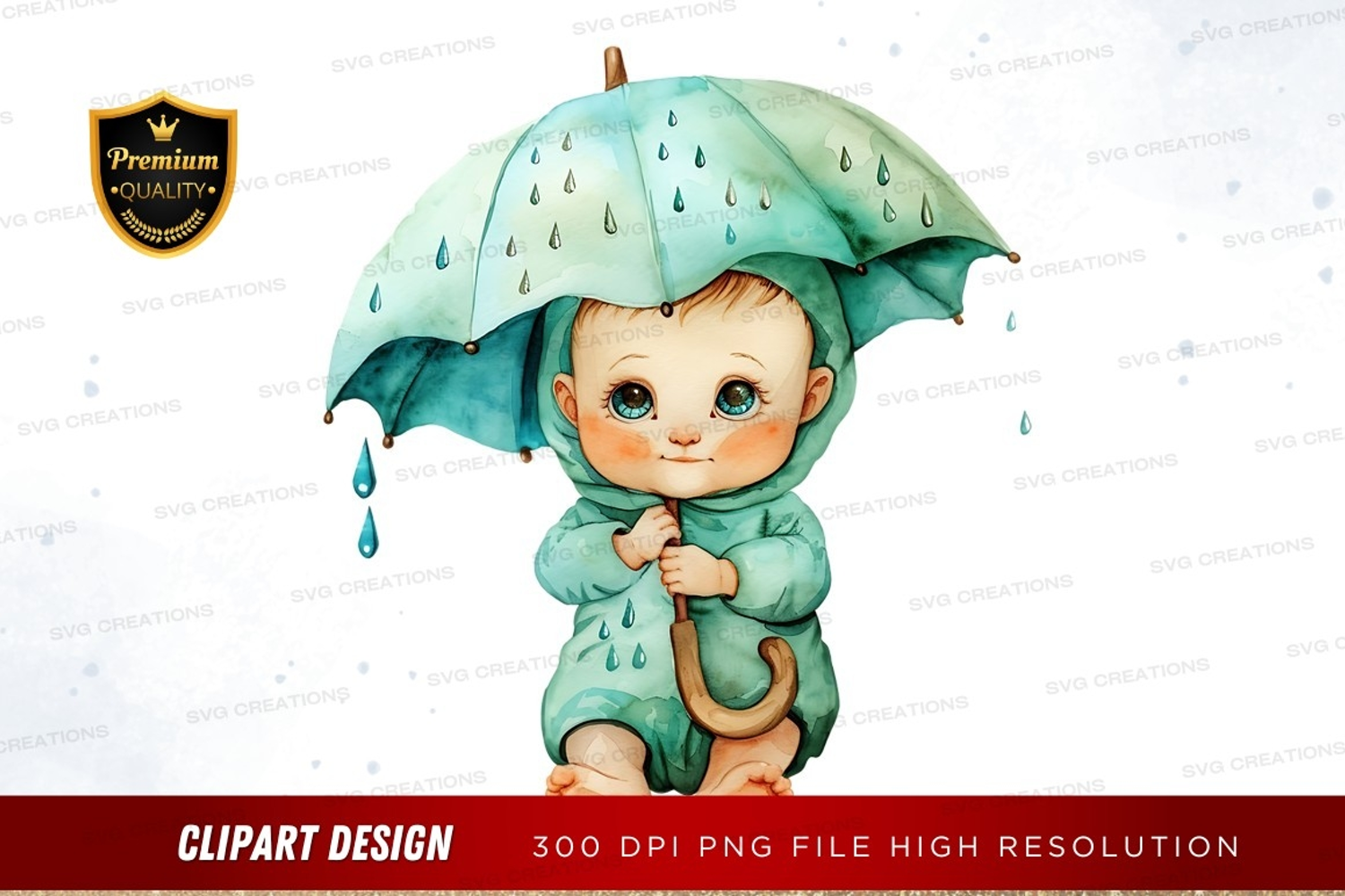 Child Illustration Cute Baby Joy Rain Butterflies Umbrella Water Droplets Raincoat