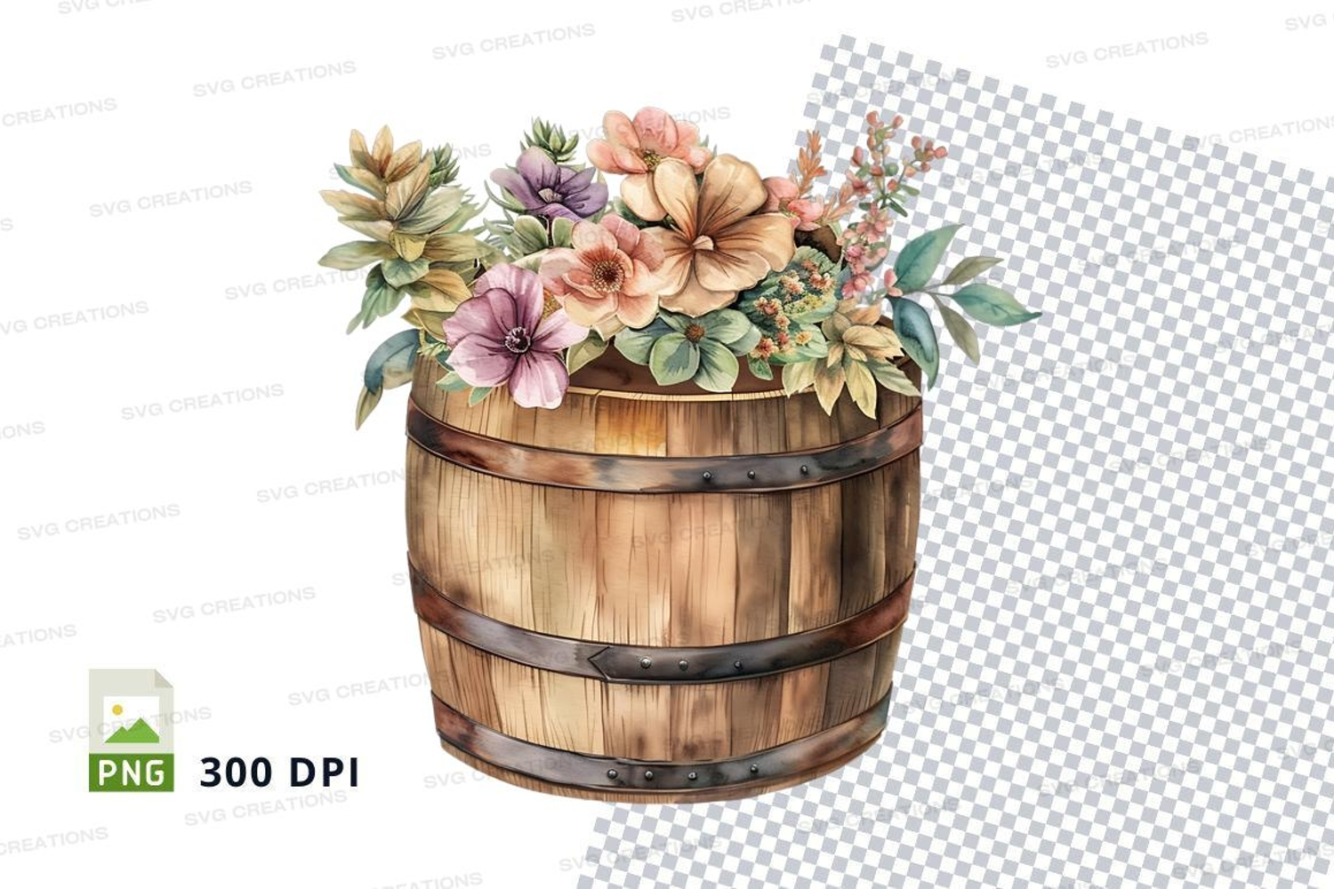 Similar Design Products to Wooden barrel with flowers clipart png