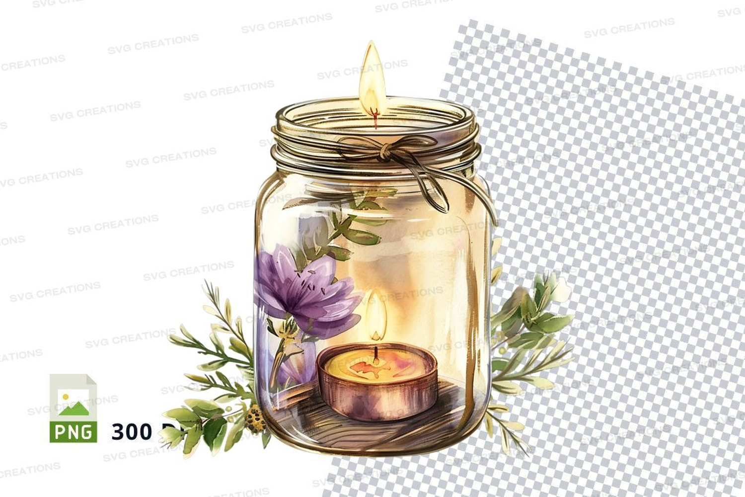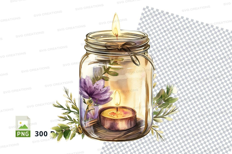 Illustration Watercolor Romantic Nature Flowers Candle Jar Cozy Home Decor Lit