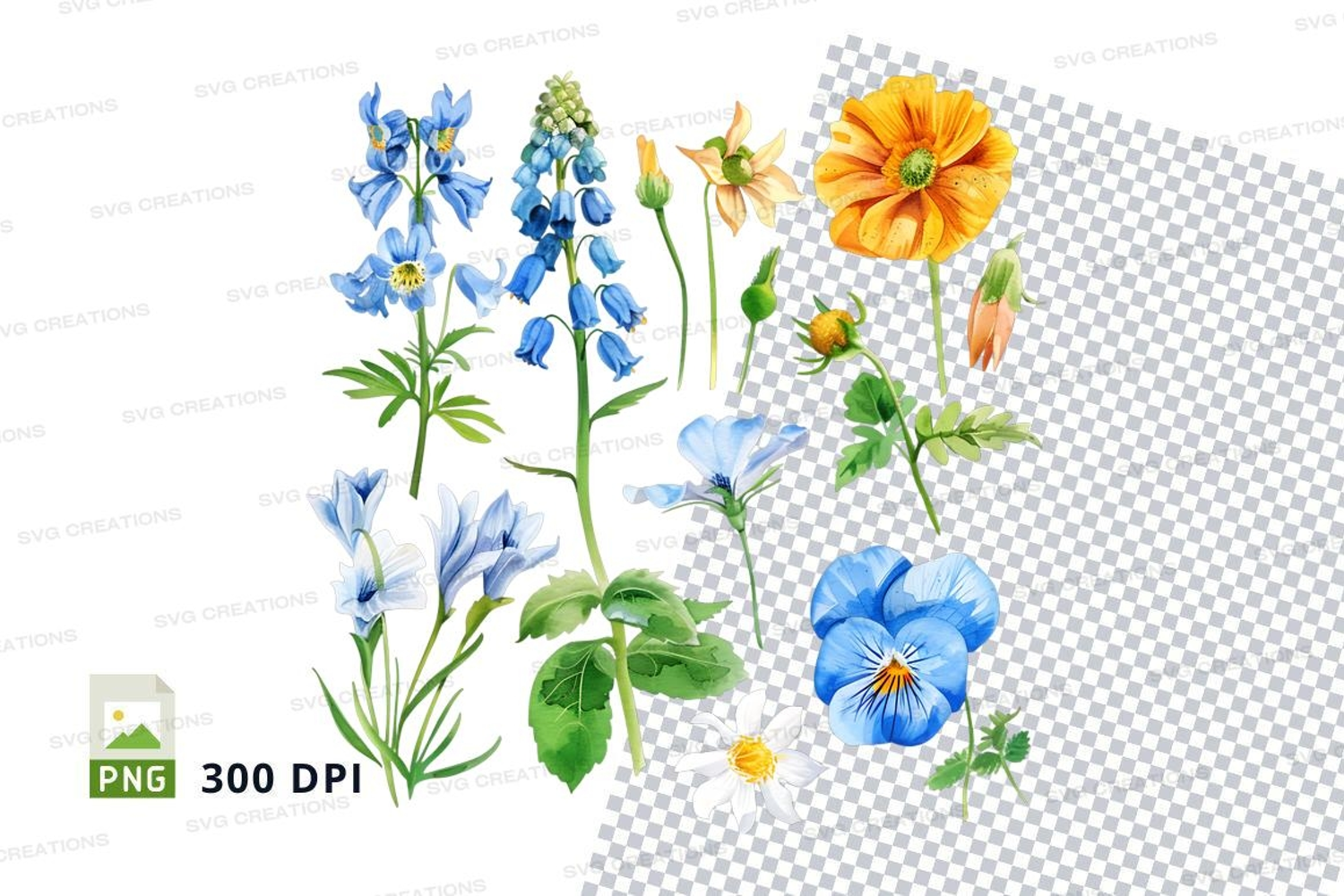 Watercolor Nature Flowers Clipart Png Daisies Poppies Botany Wildflowers Bluebells
