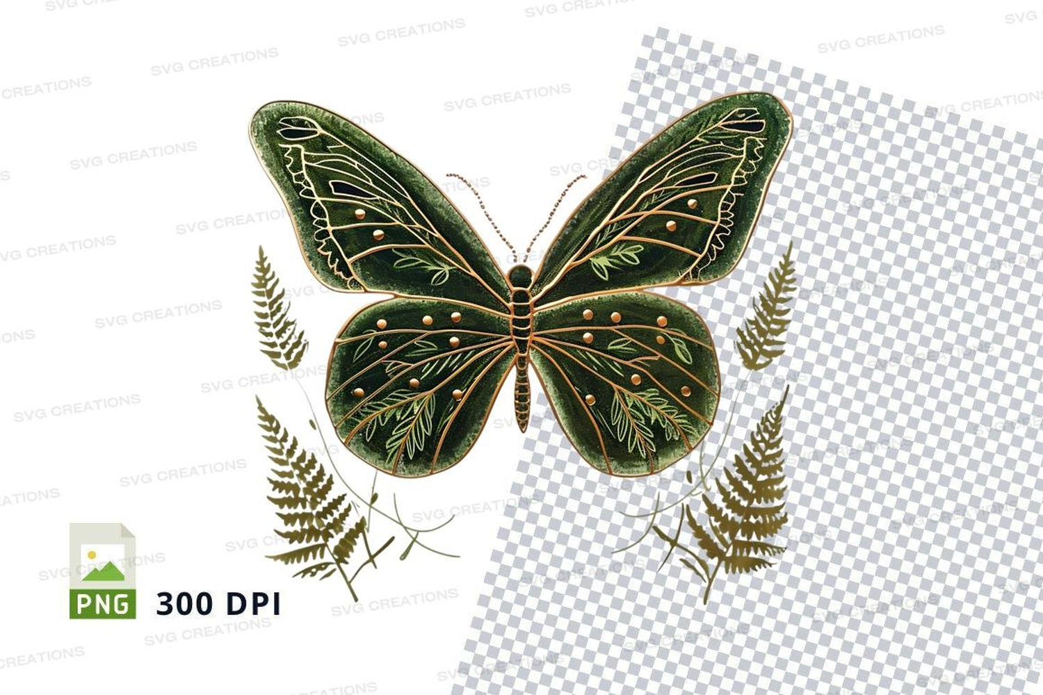Delicate Illustration Gold Nature Green Ornate Butterfly Insect Fern
