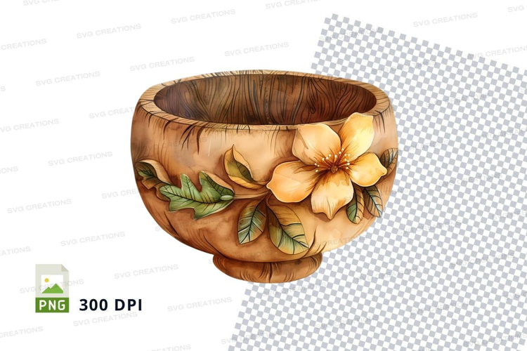Green Leaves Floral Design Yellow Flower Rustic Texture Wooden Bowl Decorative Bowl Crafted Bowl