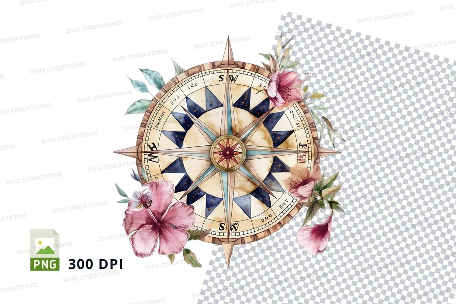Vintage Decorative Illustration Watercolor Design Nature Floral Compass Suitcase Directional