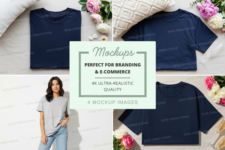 Mockup: navy blue t-shirts with floral background