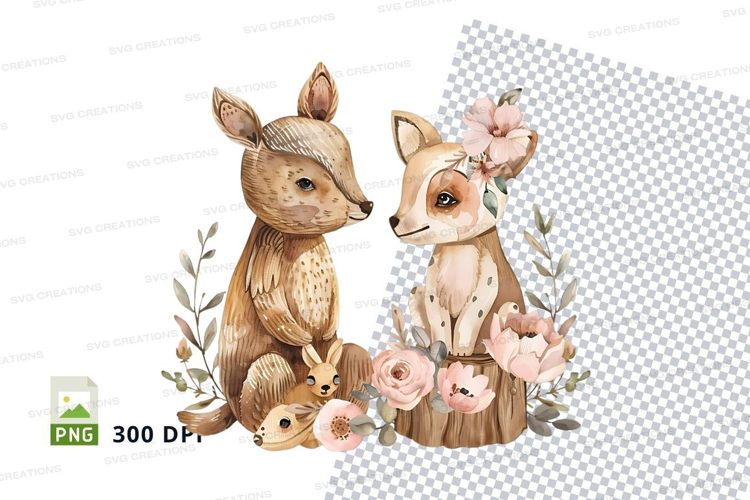 Illustration Family Watercolor Animal Nature Flowers Clipart Deer Foliage Baby Deer
