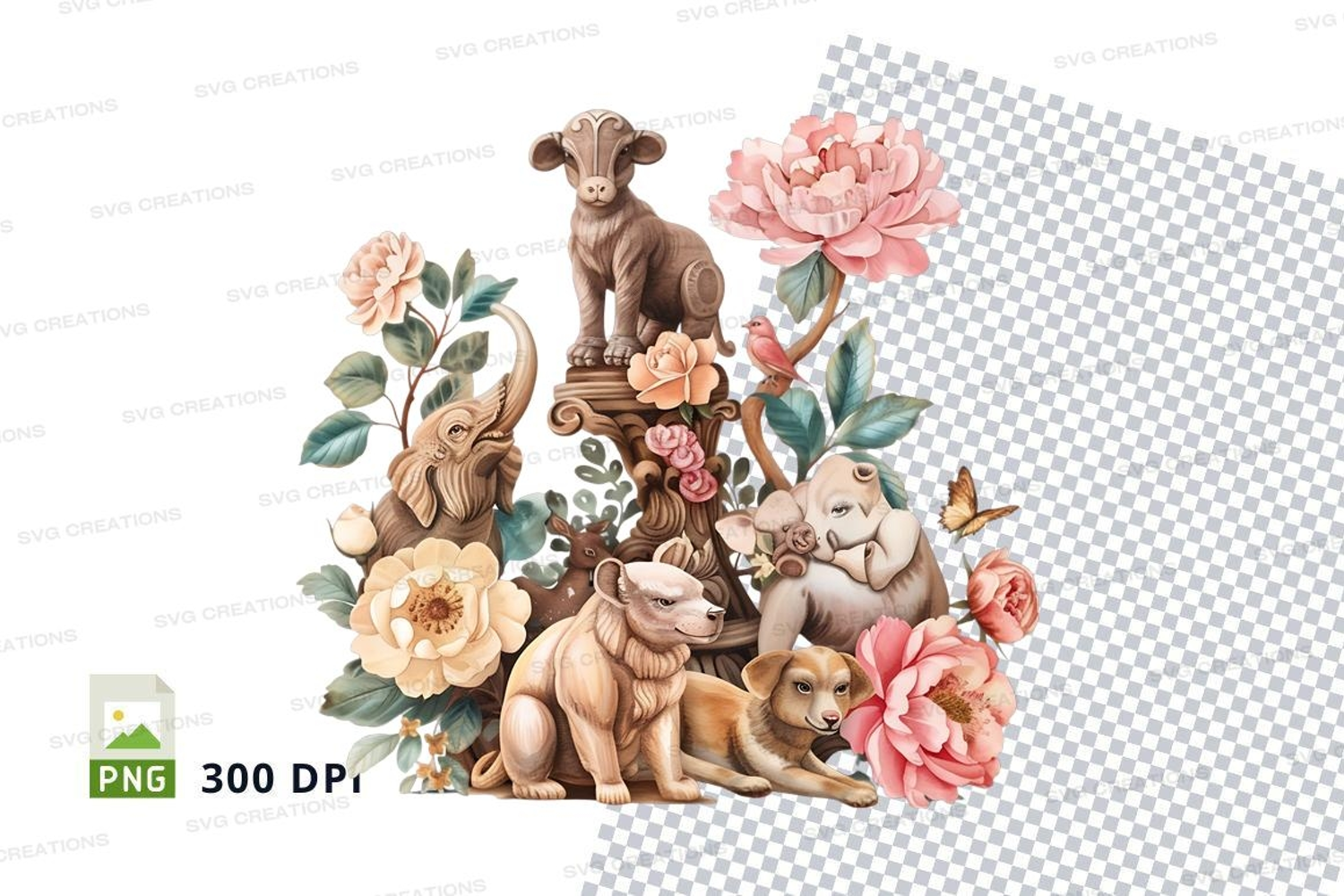 Animals Whimsical Flowers Botanical Orange Lion Elephant Fern Cow Tulips