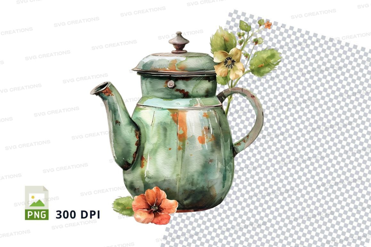 Vintage Illustration Watercolor Distressed Flowers Clipart Leaves Teapot