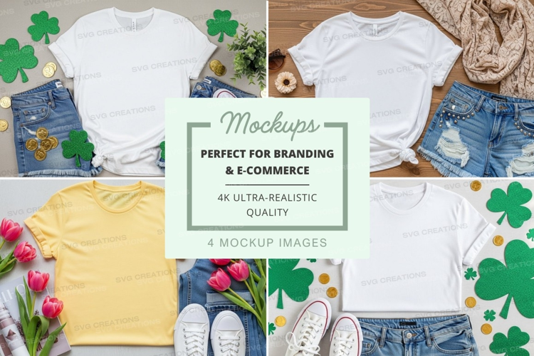 Fashion Mockup Outfit Sneakers St Patrick's Day Gold Coins Shamrocks White T-shirt Denim Shorts Yellow T-shirt