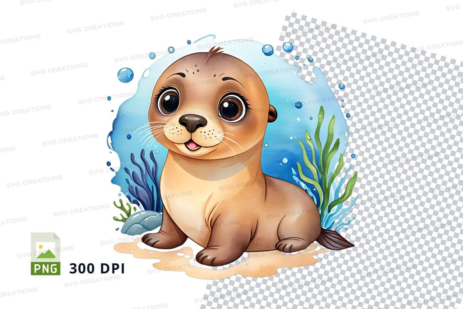 Child Cartoon Animals Cute Water Bubbles Baby Seal Seaweed Sand Seal Pup