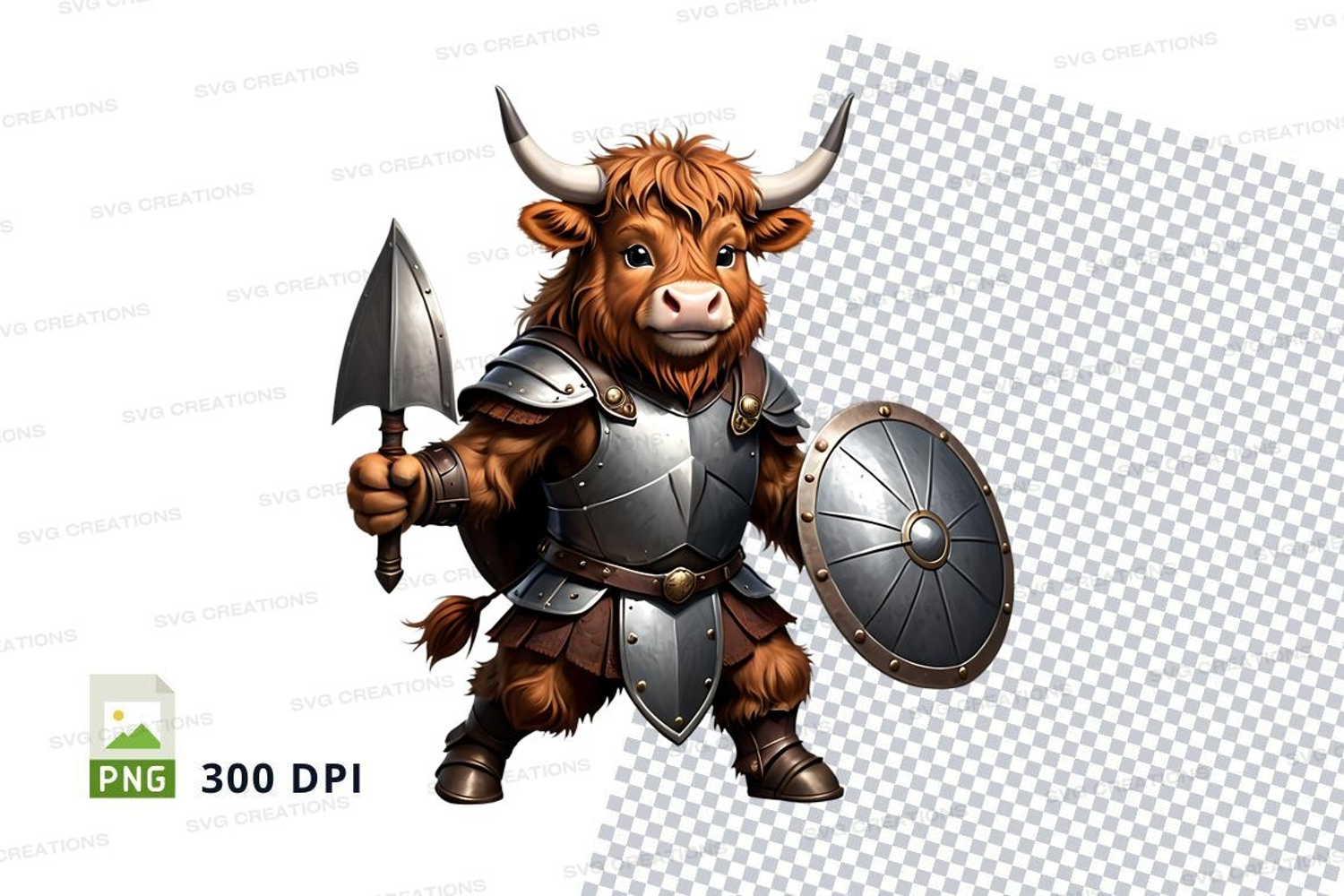 Cartoon Fantasy Medieval Shield Warrior Armor Battle Axe Highland Cow