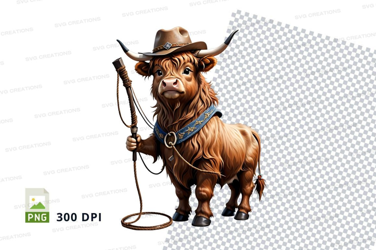 Cartoon Animal Whimsical Cowboy Hat Harness Lasso Highland Cow