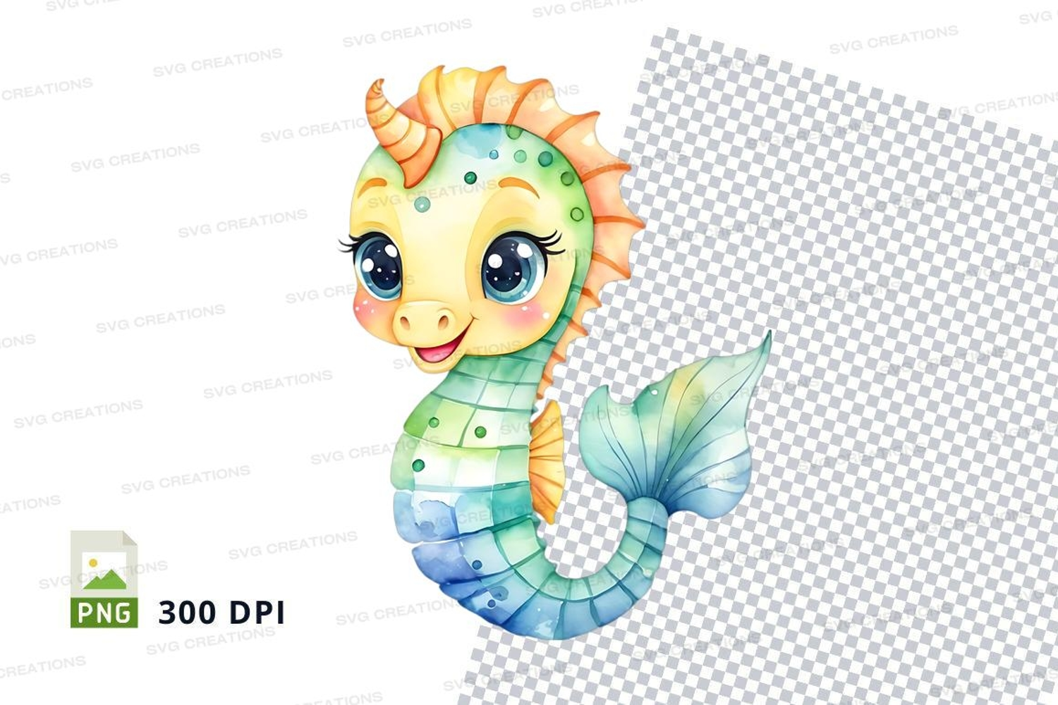 Illustration Cartoon Cute Green Friendly Blue Yellow Vibrant Seahorse Big Eyes