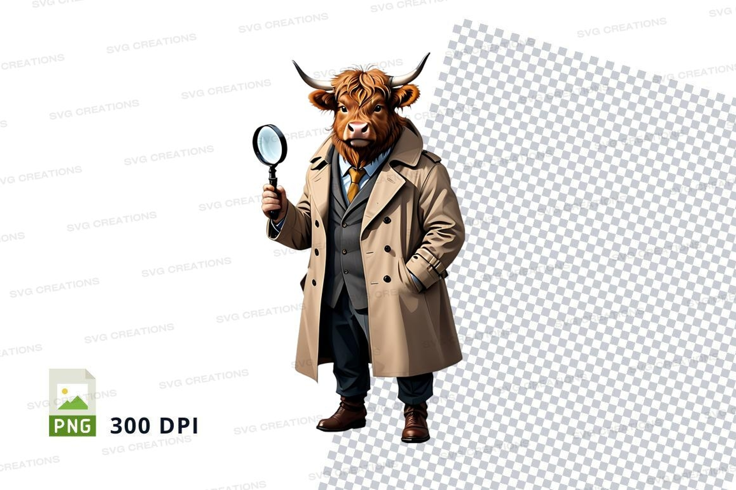 Cartoon Whimsical Mystery Detective Magnifying Glass Highland Cow Trench Coat Golden Eel