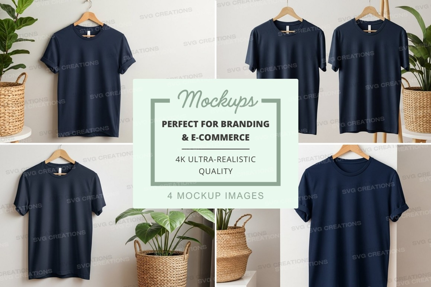 Mockup Plants White Wall Wooden Hanger Woven Basket Navy Blue T-shirt