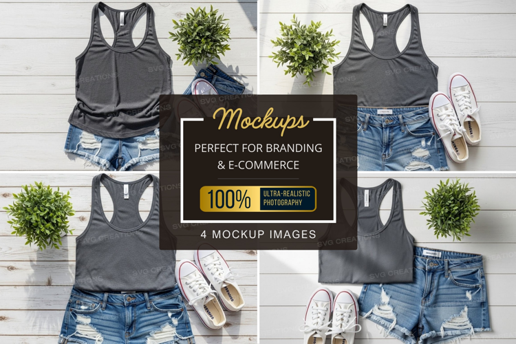 Summer Fashion Fashion Mockup Potted Plants Denim Shorts White Wooden Background Grey Tank Top Casual Wear White Sneakers Summer Outfits Distressed Jeans