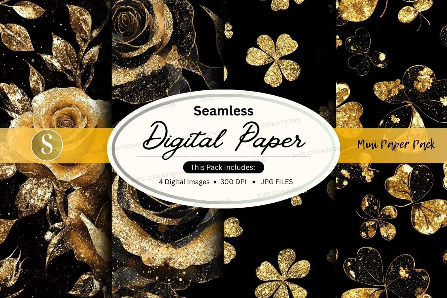Elegant Black Luxury Golden Pattern Seamless Roses Glitter Sparkle Shamrocks