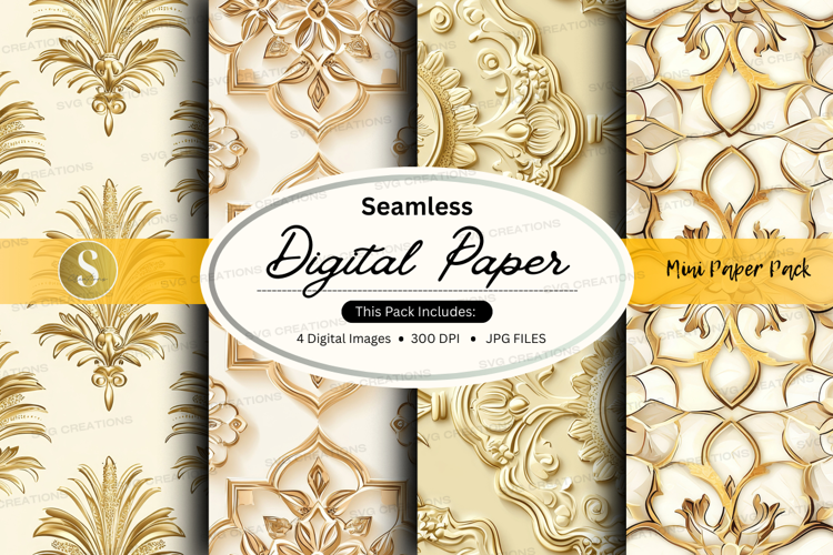 Decorative Gold Design Ornate Pattern Digital Paper Seamless White Background Crafting Embossed