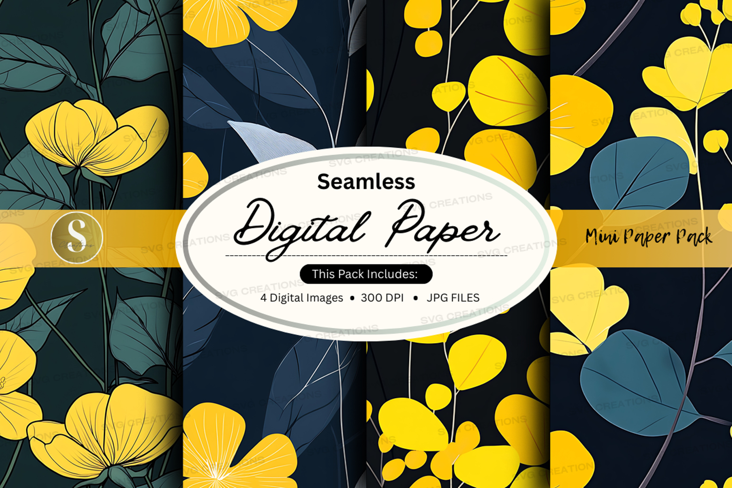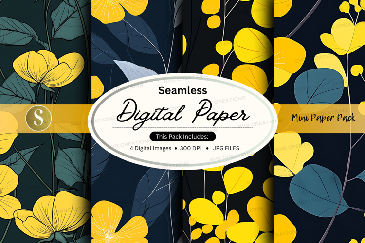 Green Floral Digital Paper Yellow Seamless Crafting 300 Dpi Jpg Files Dark Background