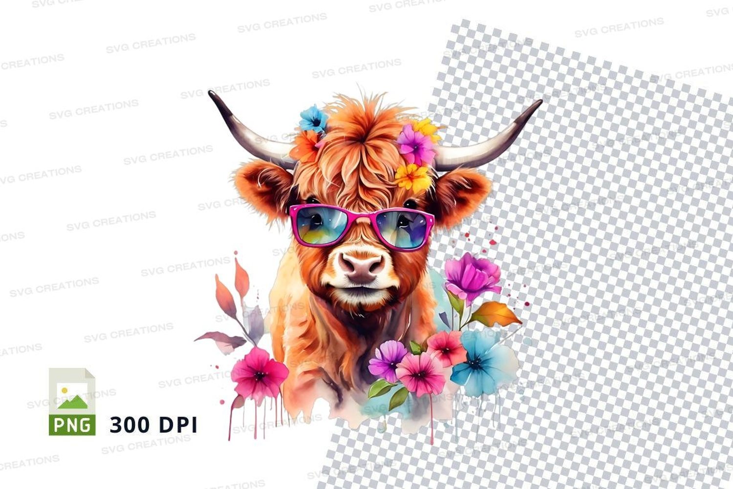 Illustration Whimsical Colorful Flowers Clipart Sunglasses Cow Floral Crown Highland Cow