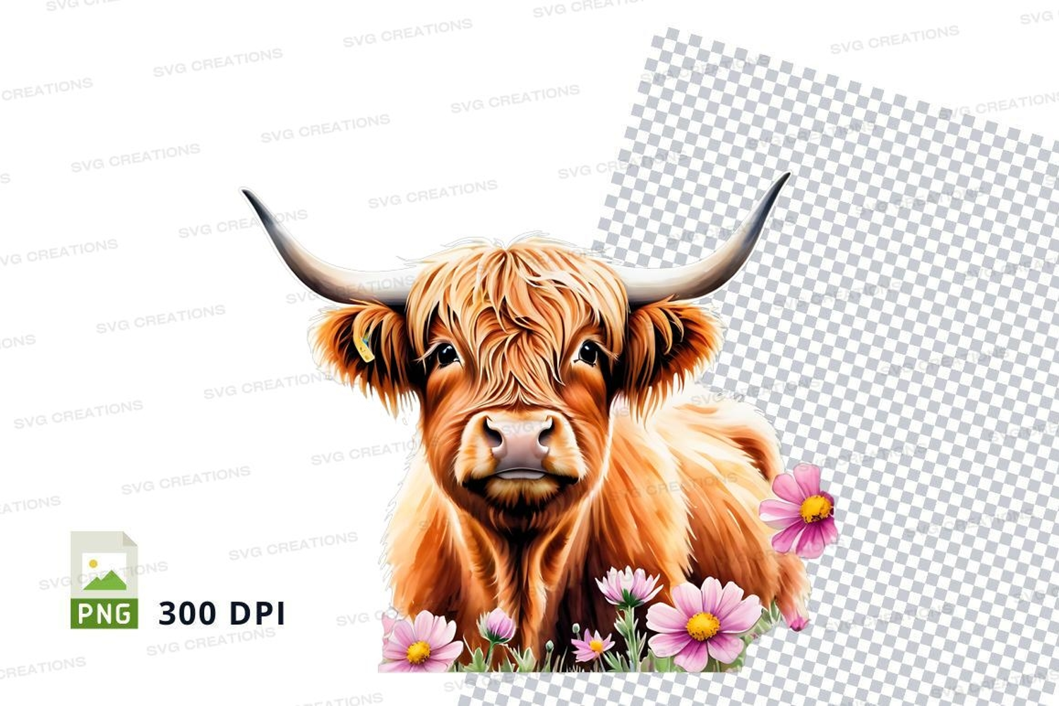 Illustration Flowers Clipart Pink Flowers Purple Flowers Cow Highland Cow Long Horns Shaggy Fur
