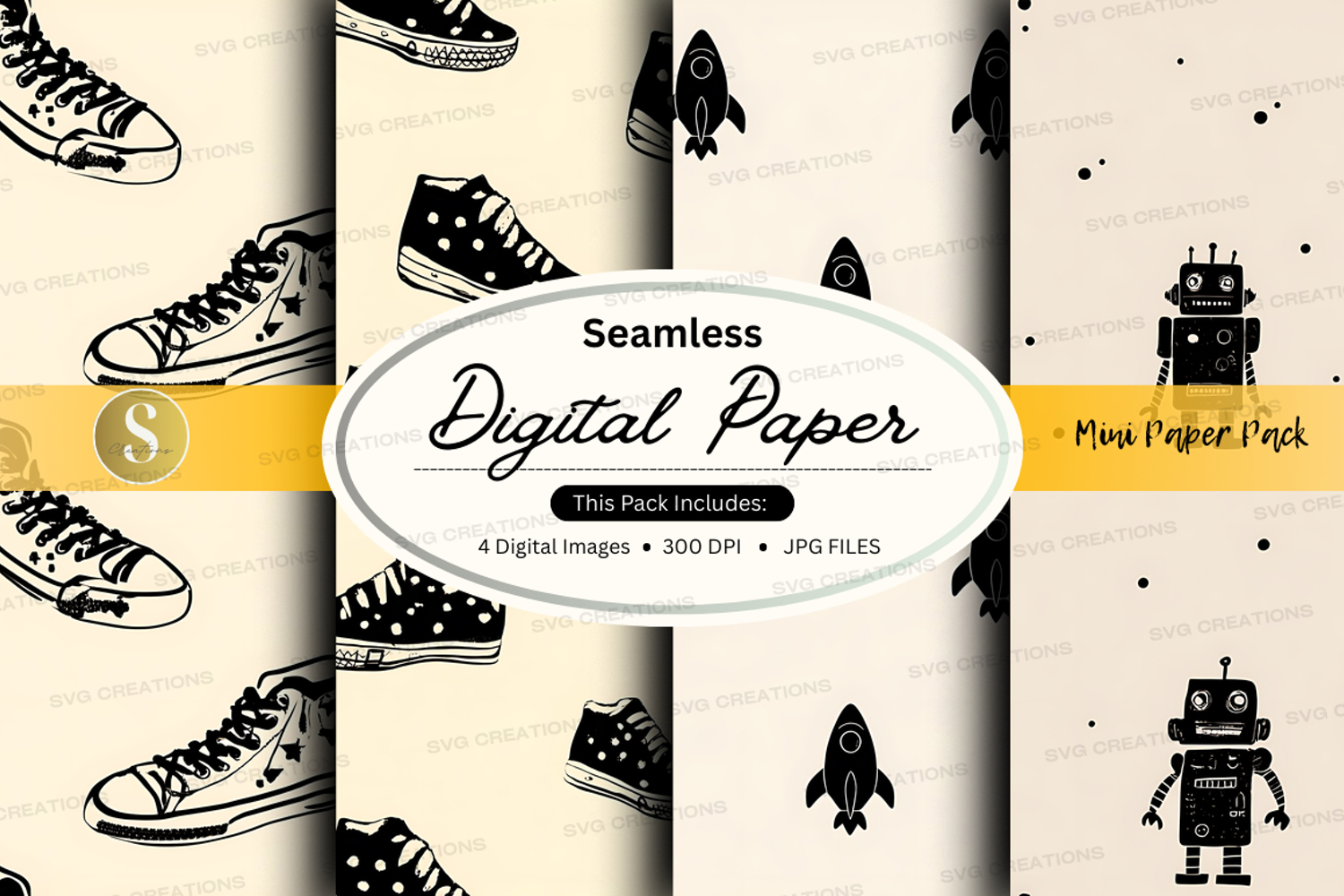 Digital Paper Seamless 300 Dpi Sneakers Rockets Robots Jpg Files Mini Paper Pack
