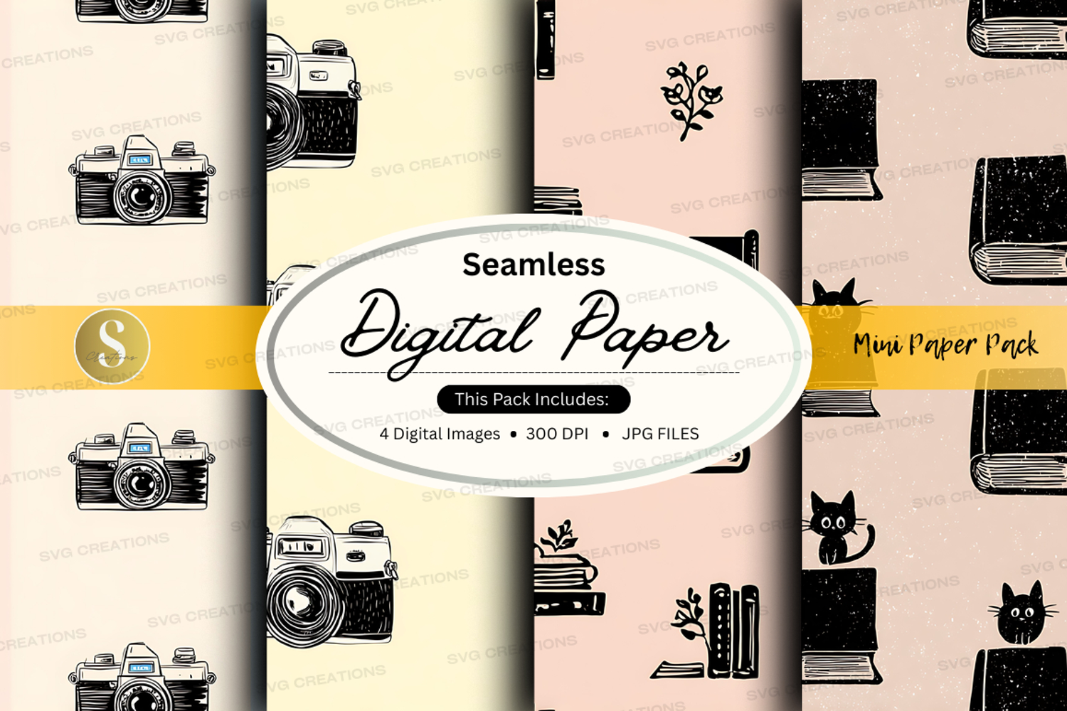 Digital Paper Seamless Cats Books 300 Dpi Jpg Files Vintage Cameras Mini Paper Pack
