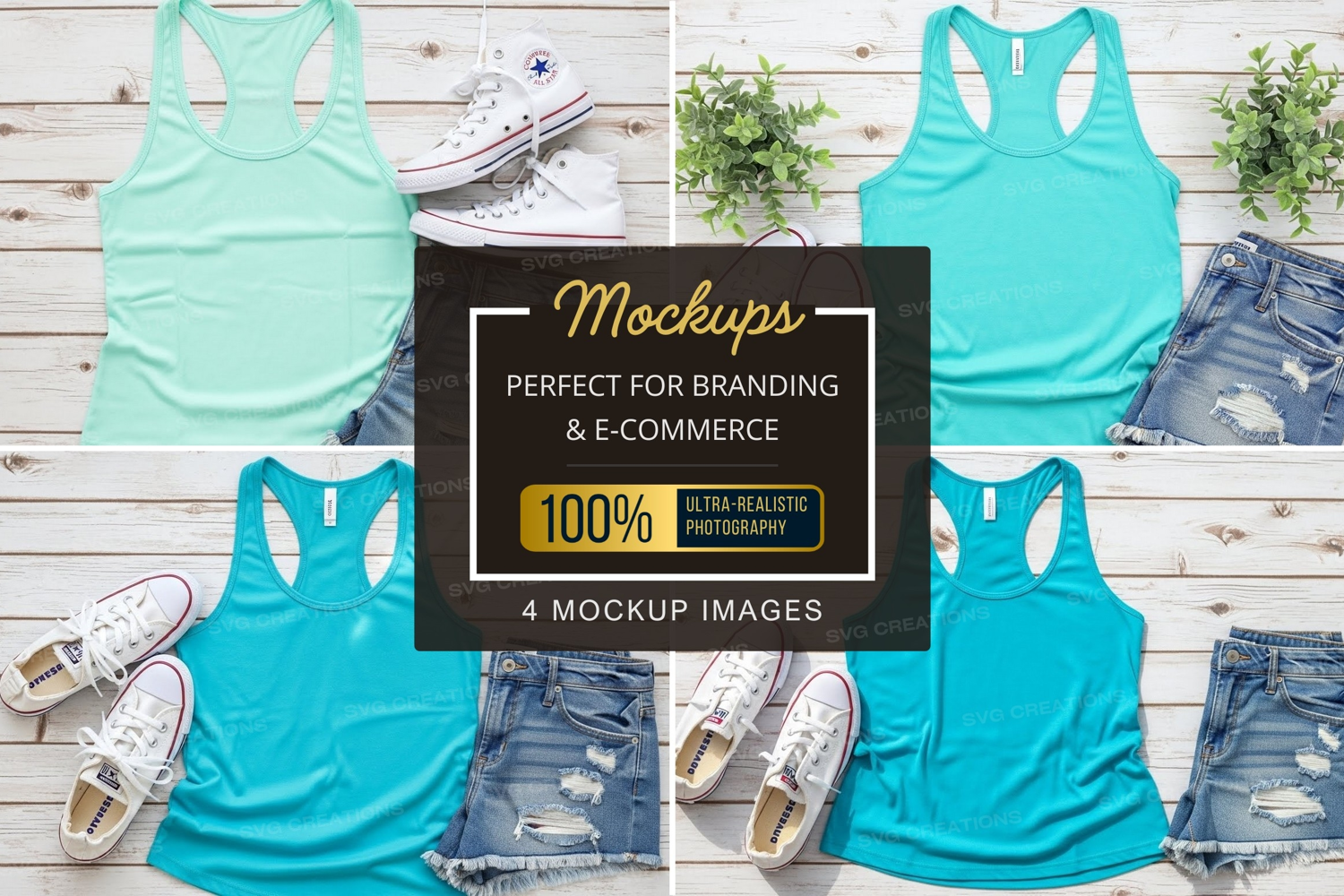 Summer Distressed Teal Flat Lay Outfit Tank Top Racerback Denim Shorts Casual Wear White Sneakers