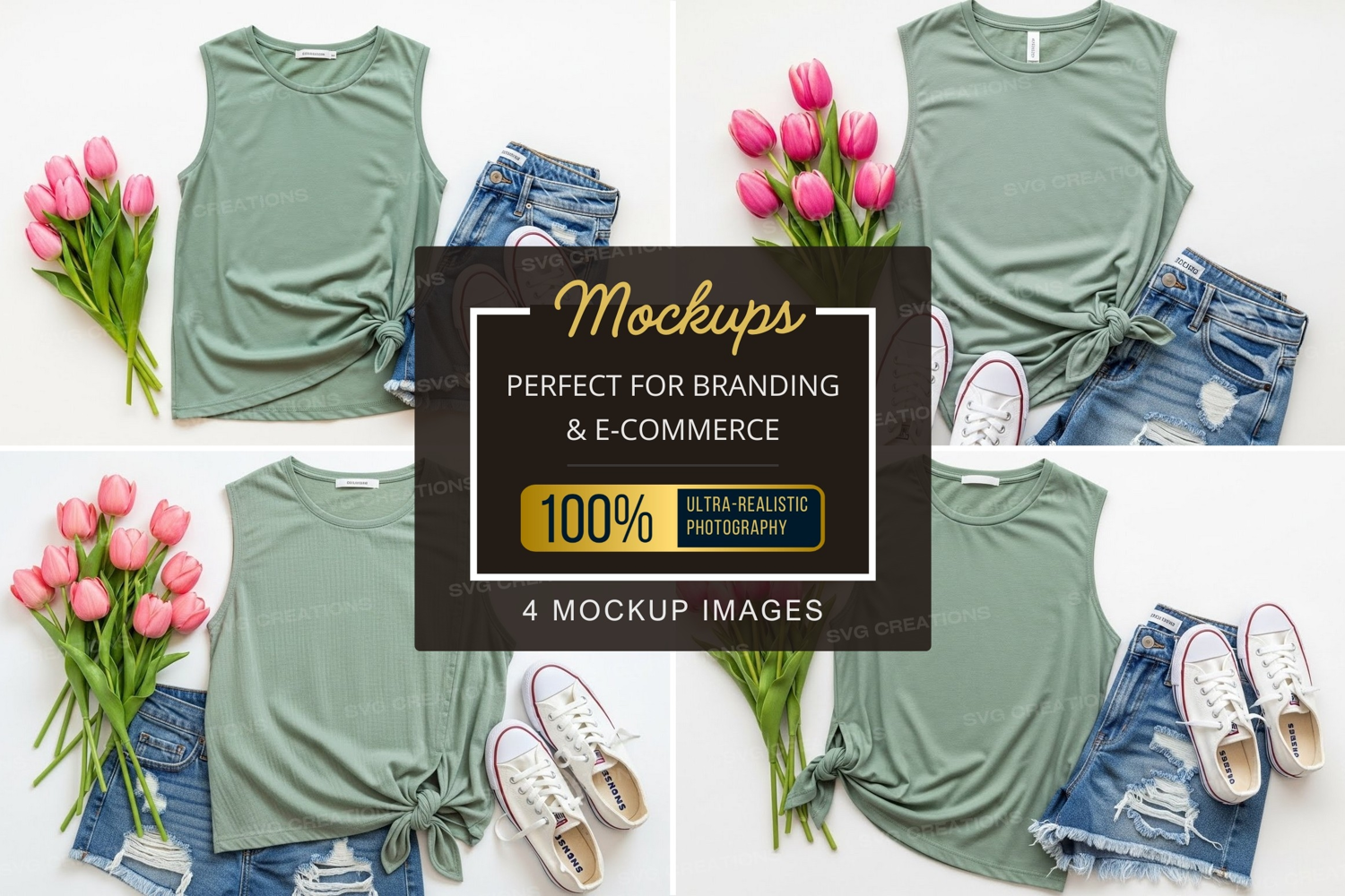 Spring Fashion Clothing Mockup Top Sneakers Tulips Denim Shorts