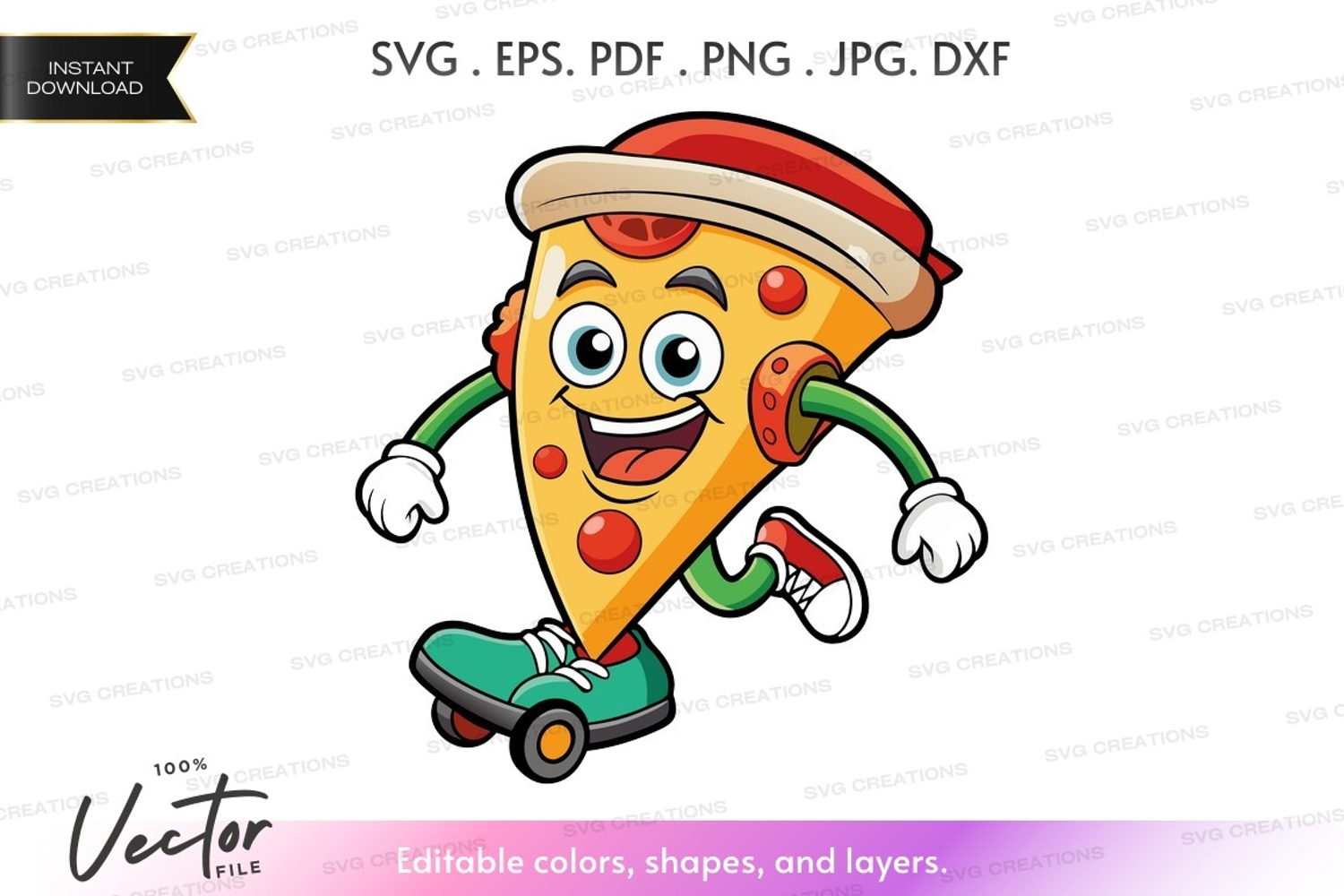 Character Cartoon Fun Dynamic Happy Hat Pizza Slice Sneakers Skateboarding