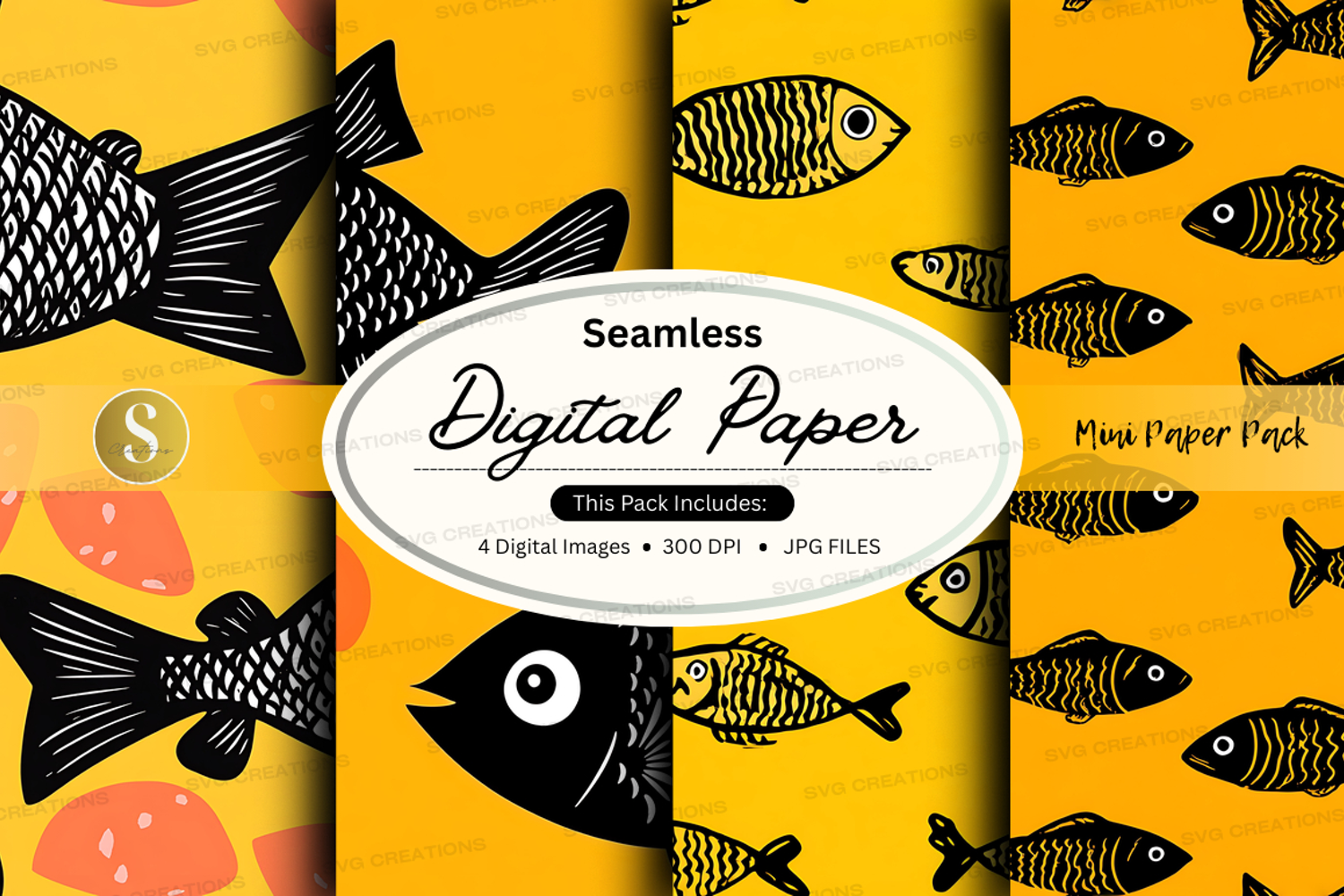 Digital Paper Seamless Pattern 300 Dpi Yellow Background Fish Pattern Jpeg Files