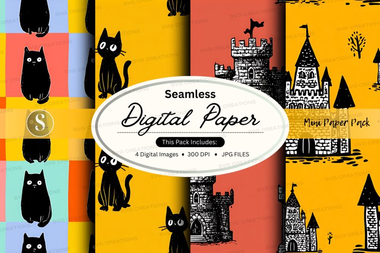 Digital Paper Seamless 300 Dpi Colorful Backgrounds Black Cats Castles Jpeg Files