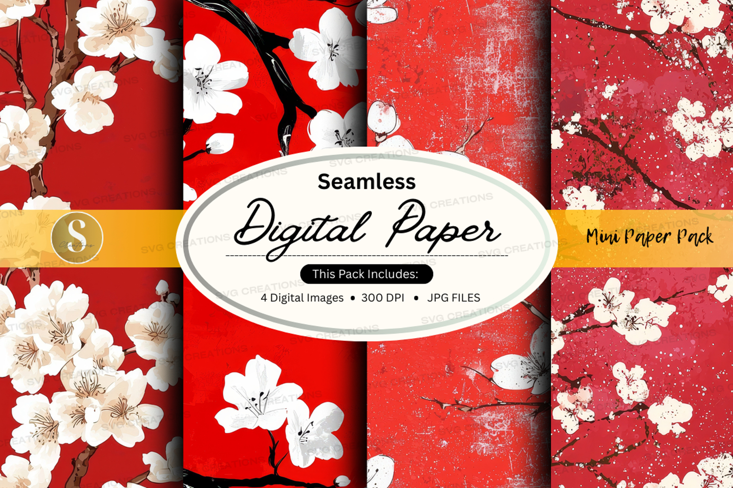 Digital Paper Seamless Pattern 300 Dpi Red Background Cherry Blossom Jpg Files