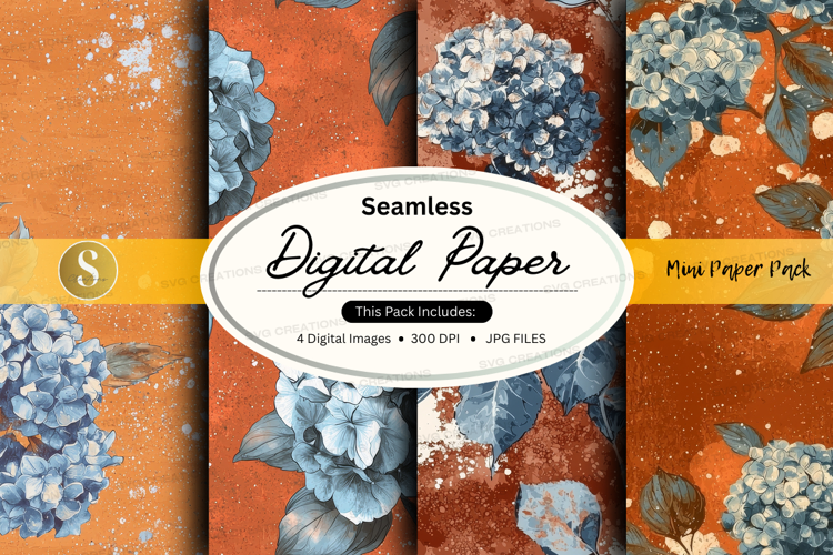 Floral Digital Paper Seamless Hydrangea Blue Flowers Jpg 300 Dpi Orange Background