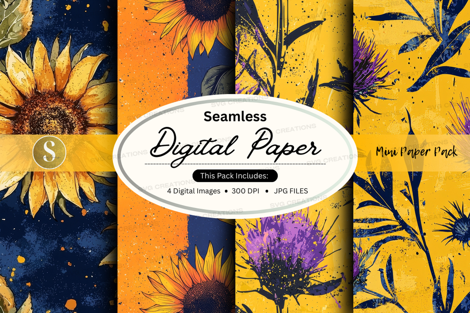 Floral Digital Paper Seamless Pattern 300 Dpi Jpeg Files Sunflower
