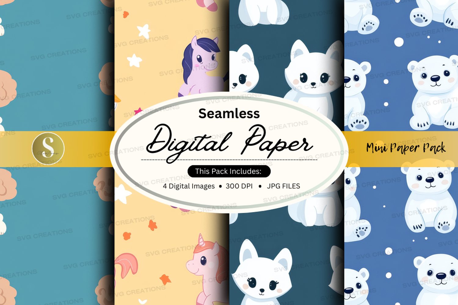 Digital Paper Seamless Patterns 300 Dpi Unicorns Polar Bears Colorful Backgrounds Cute Illustrations Jpeg Files