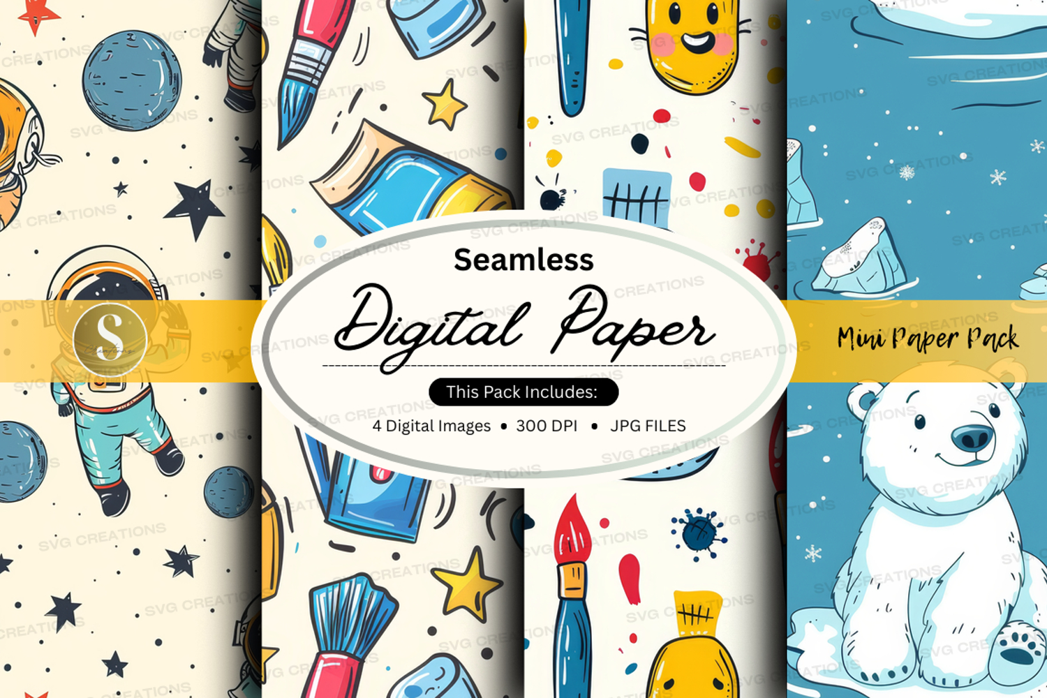 Digital Paper Seamless Patterns 300 Dpi Art Supplies Polar Bears Cute Illustrations Space Theme Jpeg Files