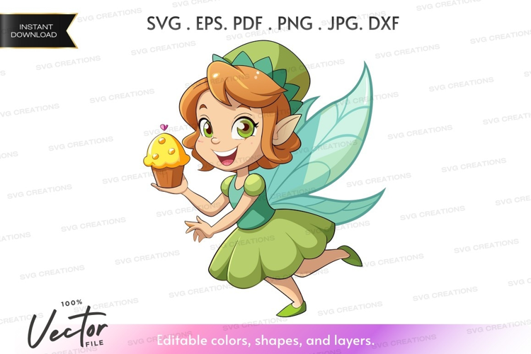 Illustration Sweet Green Girl Fairy Yellow Cheerful Cupcake Wings Vector Silhouette