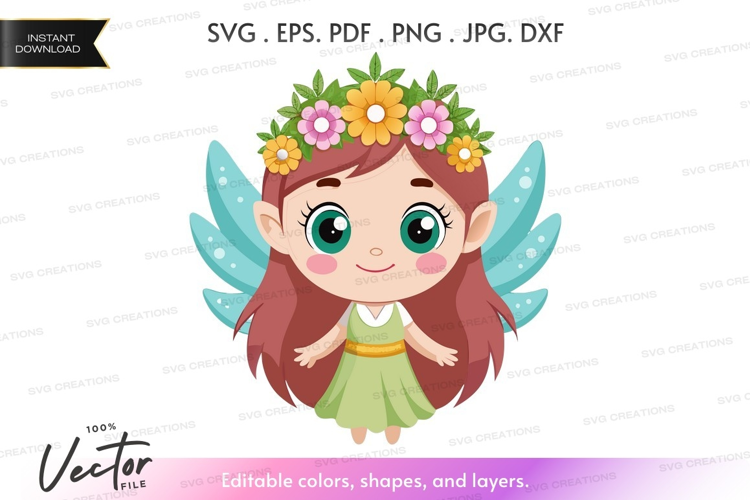 Fairy Angel Wings Vector Silhouette Long Hair Flower Headband Fairy Illustration Flower Crown Cute Fairy Fantasy Character Child-friendly
