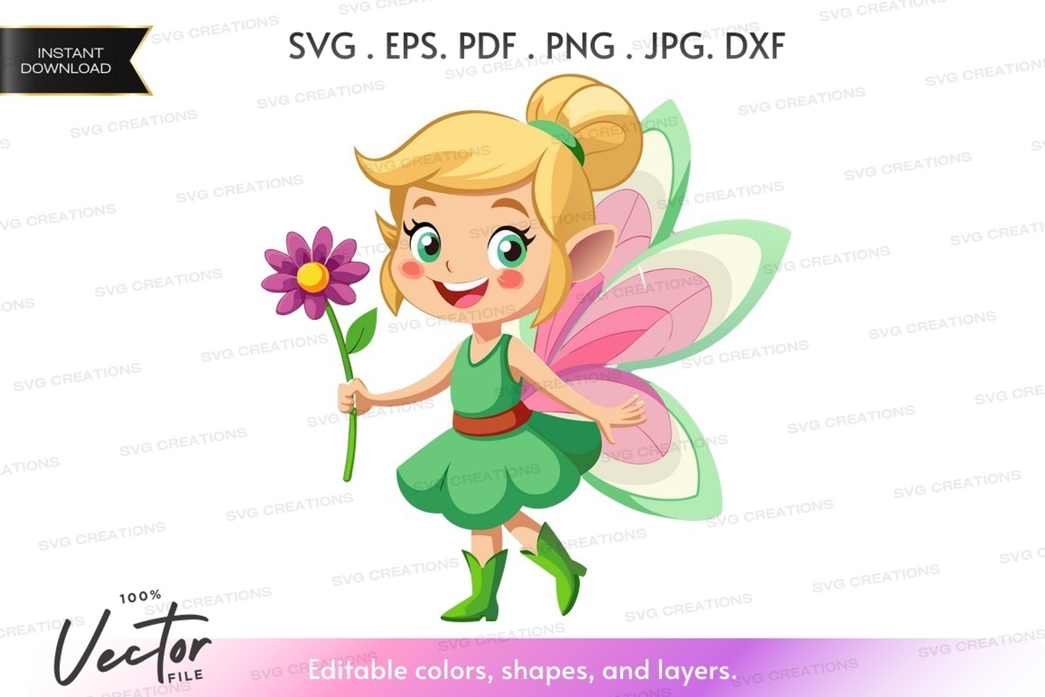 Cartoon Happy Girl Flower Fairy Wings Blonde Vector Silhouette Pink Wings Green Dress