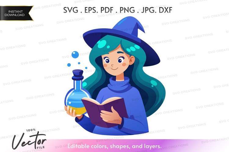 Young Magic Witch Blue Bubbles Hat Potion Enchanting Spellbook Green Hair