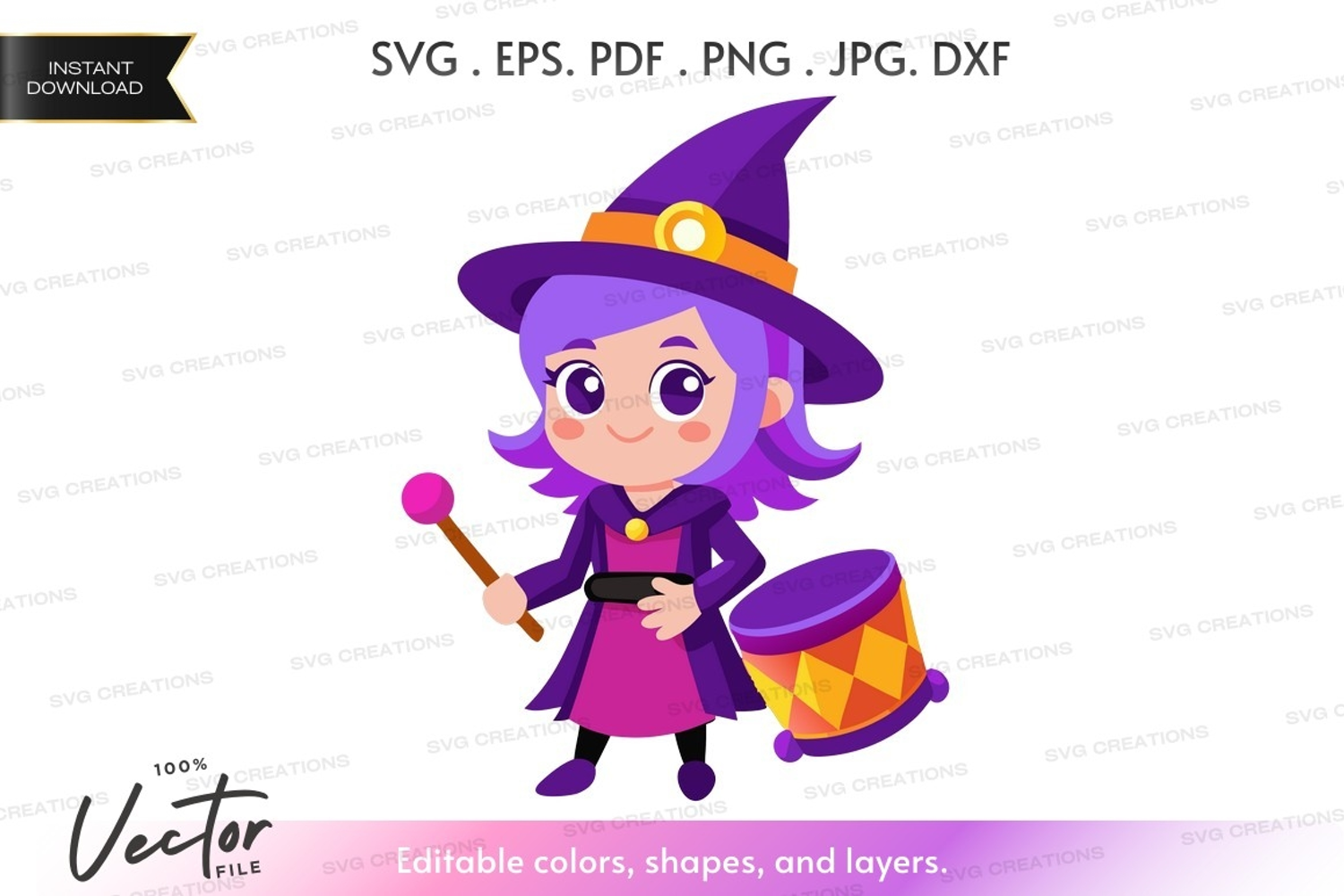 Illustration Cartoon Vector Fantasy Happy Witch Purple Costume Drum Drumstick