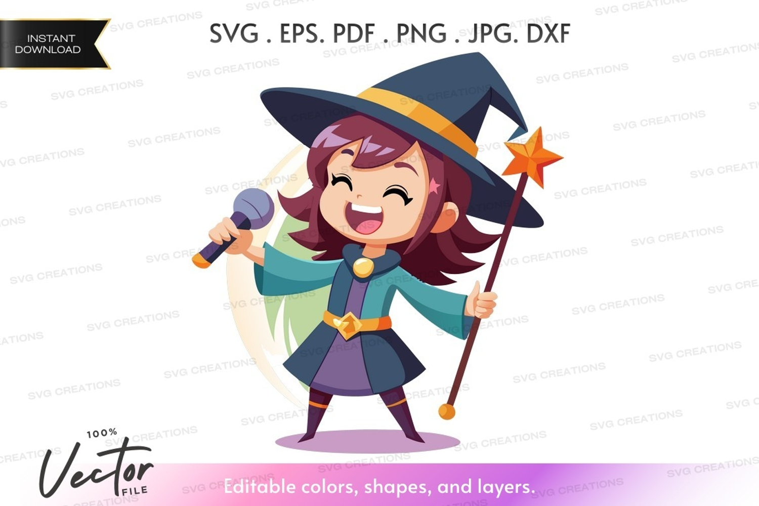 Cartoon Happy Witch Microphone Witch's Hat Singing Vector Silhouette Magic Wand Purple Hair Blue Outfit