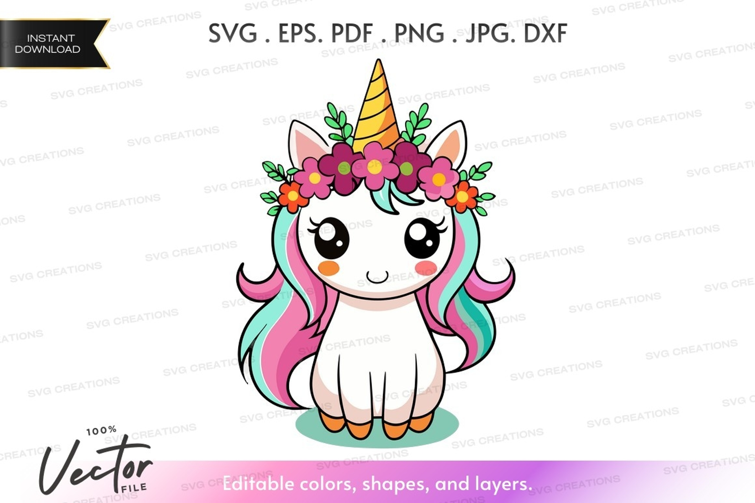 Illustration Cartoon Fantasy Whimsical Cute Colorful Horn Unicorn Vector Silhouette Flower Crown