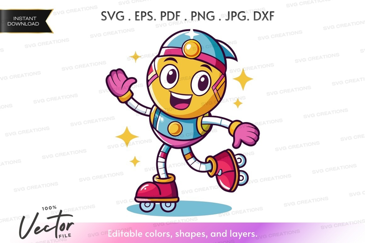 Character Cartoon Fun Happy Robot Stars Skates Outfit Joyful Roller Skating