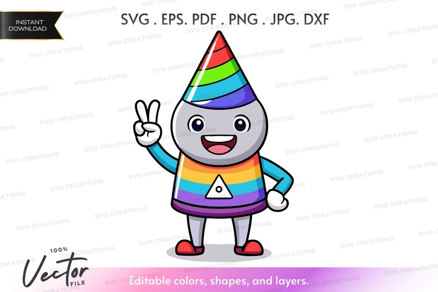Character Friendly Celebration Rainbow Water Drop Party Hat Peace Sign Triangle Symbol