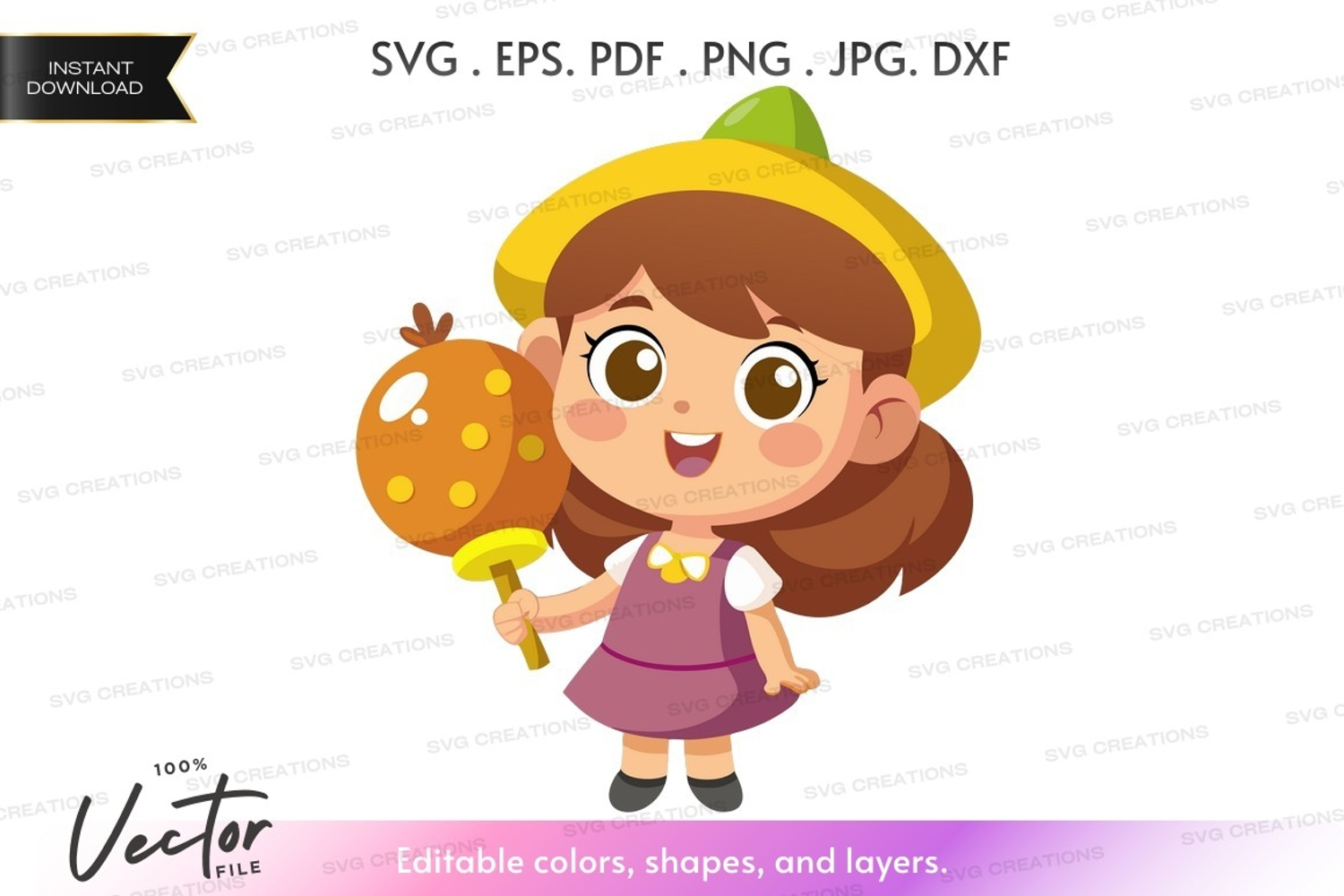 Child Cartoon Smile Happy Girl Lollipop Vector Silhouette Long Hair Straw Hat Purple Dress