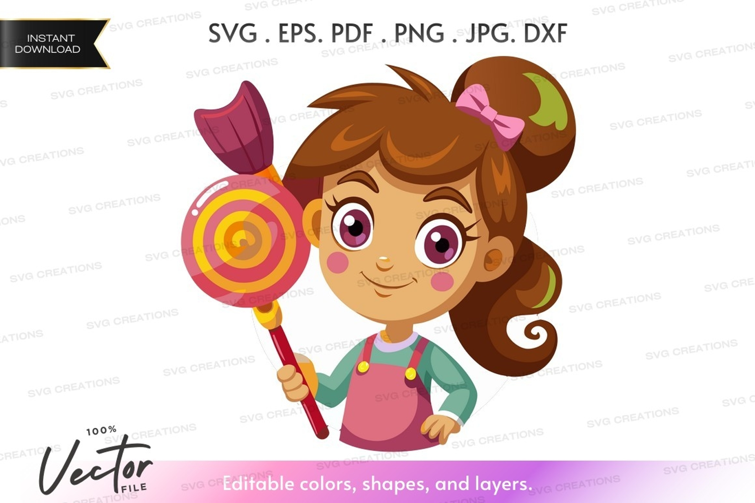 Cartoon Vector Sweet Happy Colorful Girl Silhouette Apron Lollipop Pigtails