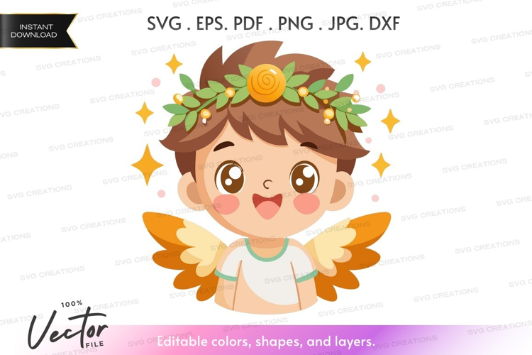 Child Illustration Cute Flower Boy Crown Wings Angel Stars