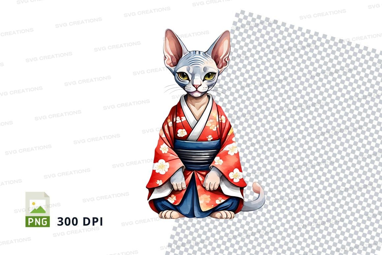 Cartoon Japanese Cat Meditation Anime Kimono Cherry Blossom Traditional Clothing Hairless Cat